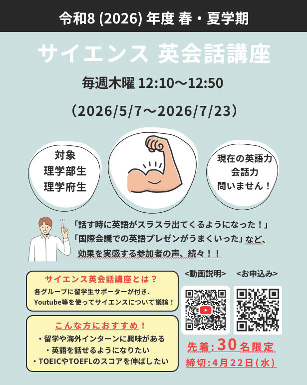 ◆2026年度春夏学期 サイエンス英会話講座参加者募集! 先着30名◆【4/22申込締切】